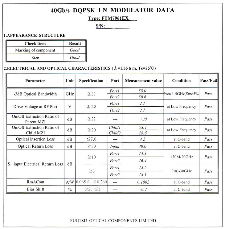 40Gbps DQPSK Modulator, Fujitsu FTM7961EX, Lithium Niobate Fiber IQ Modulator